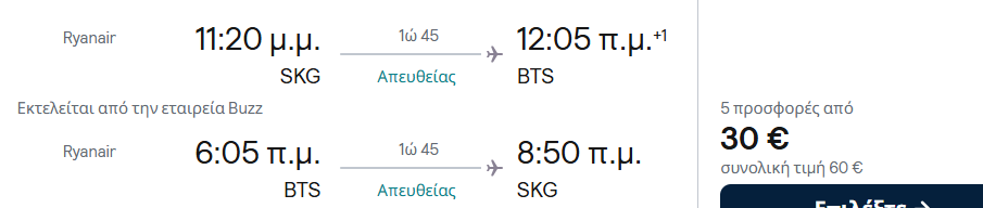- Το κόστος της πτήσης μετ’ επιστροφής για 2 άτομα είναι 60€. Το link για να κλείσετε την συγκεκριμένη πτήση θα το βρείτε εδώ, ενώ παρακάτω υπάρχει και η σχετική εικόνα: